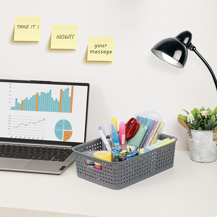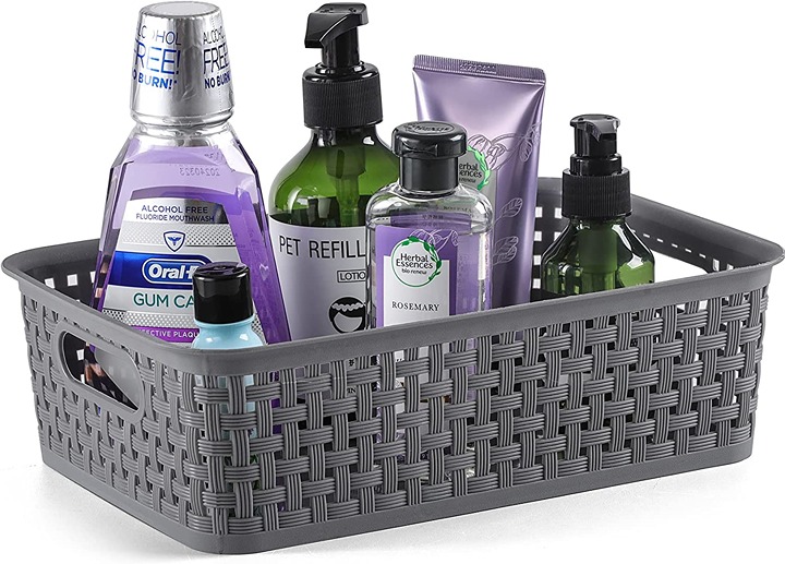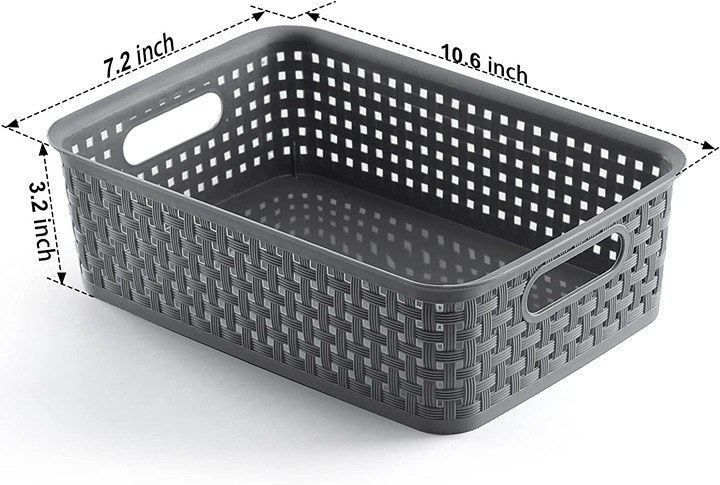 PRODUCT CONFIGURATION: 12 woven pattern plastic baskets, gray. Dimensions:10.6 L x 7.2 W x 3.2 H, basket use small holes design helping ventilation, better organization and storage items.