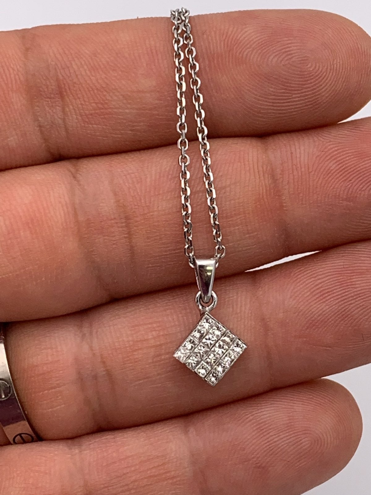 This piece features a sideways square shape pendant with .60ct of invisible set round diamonds on a 14K white gold chain and secured with a lobster clasp. This pendant necklace is a classic design for every day wear.