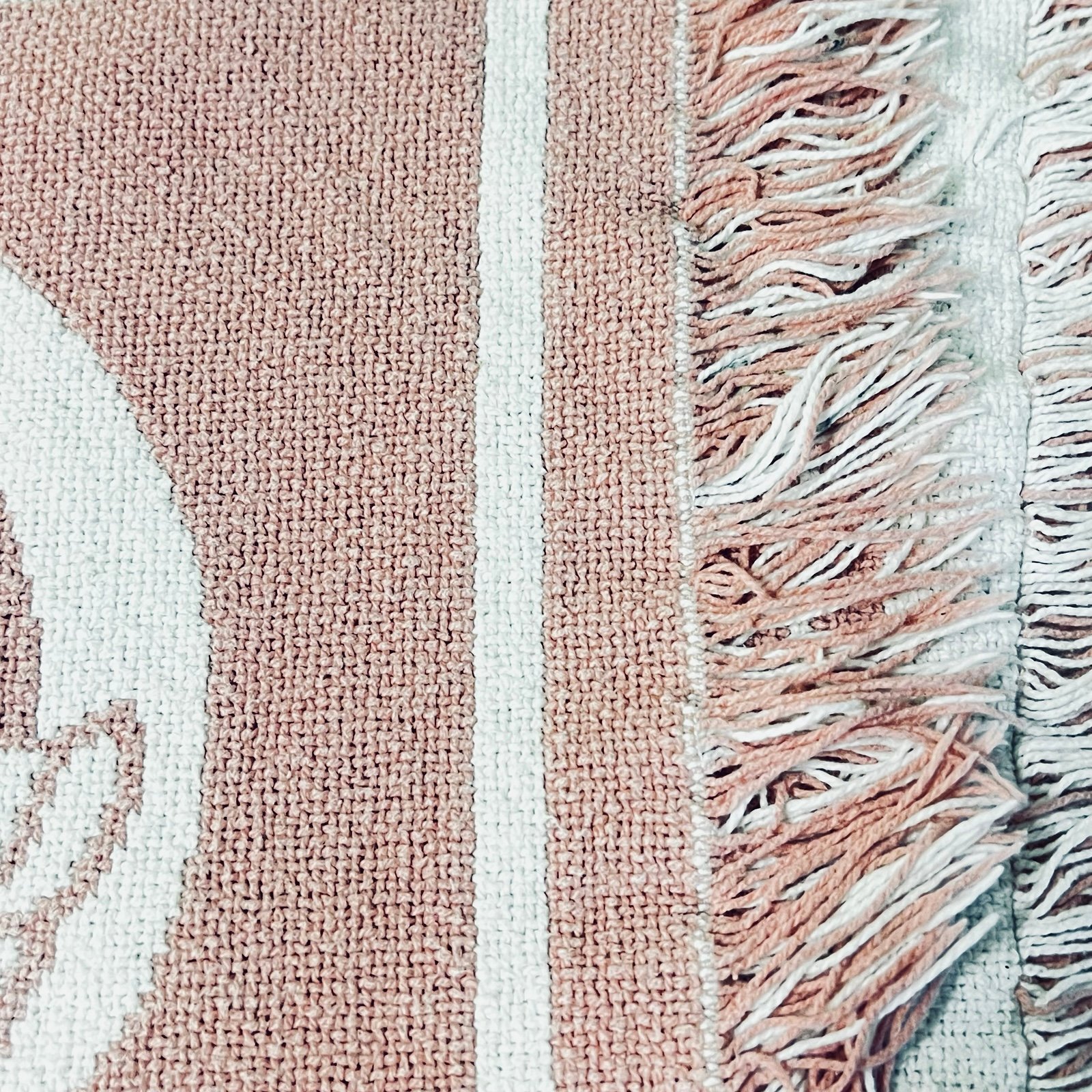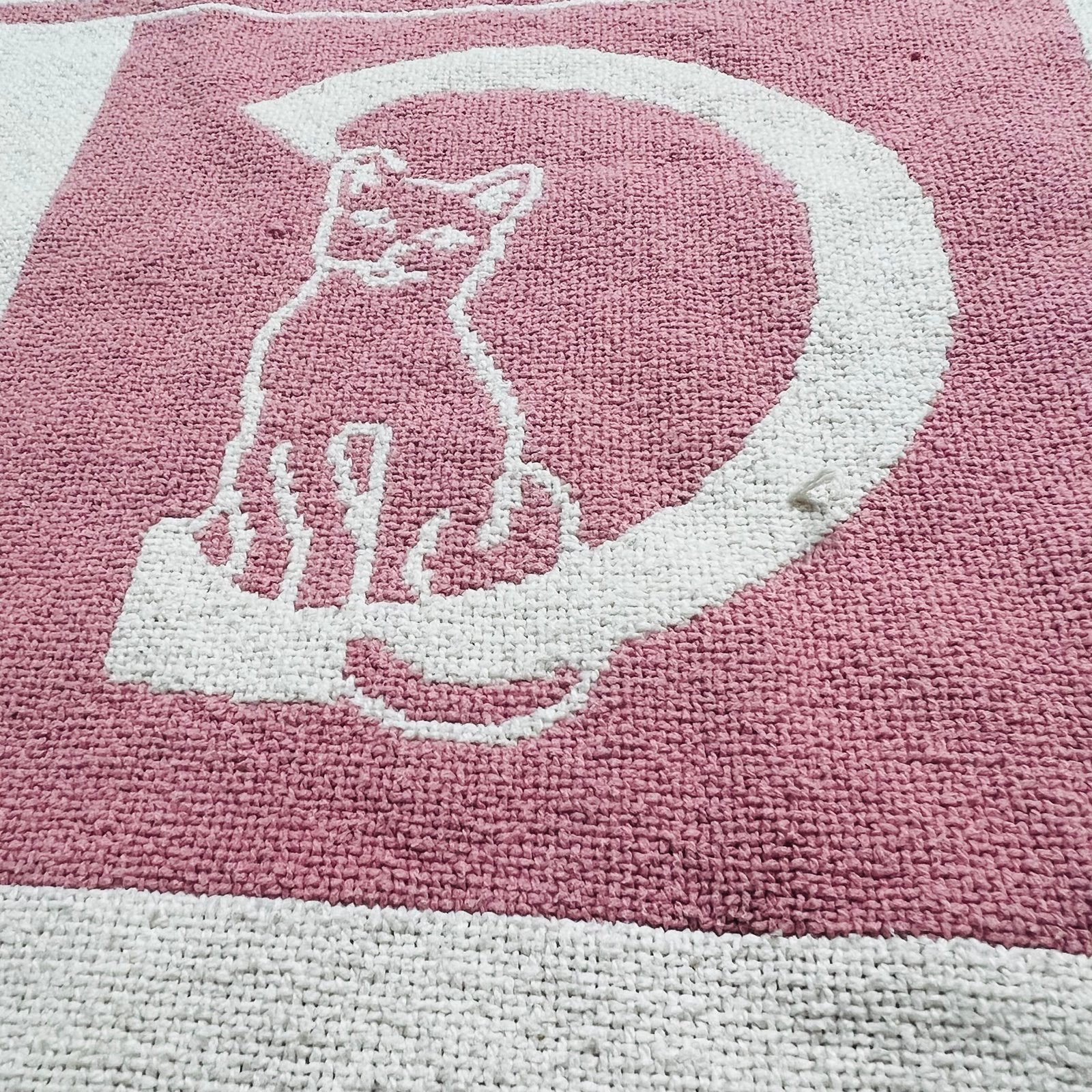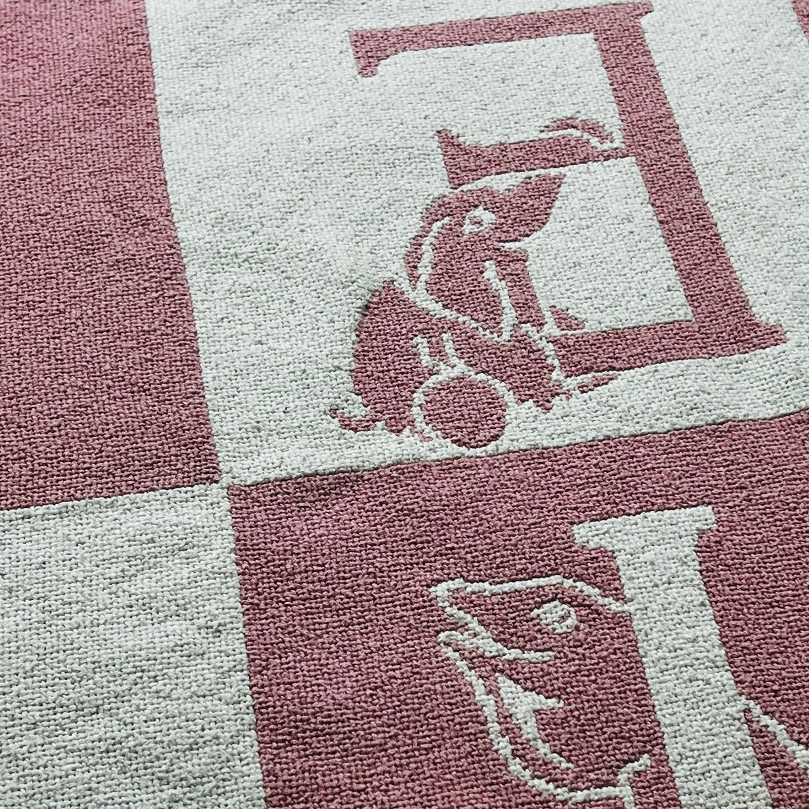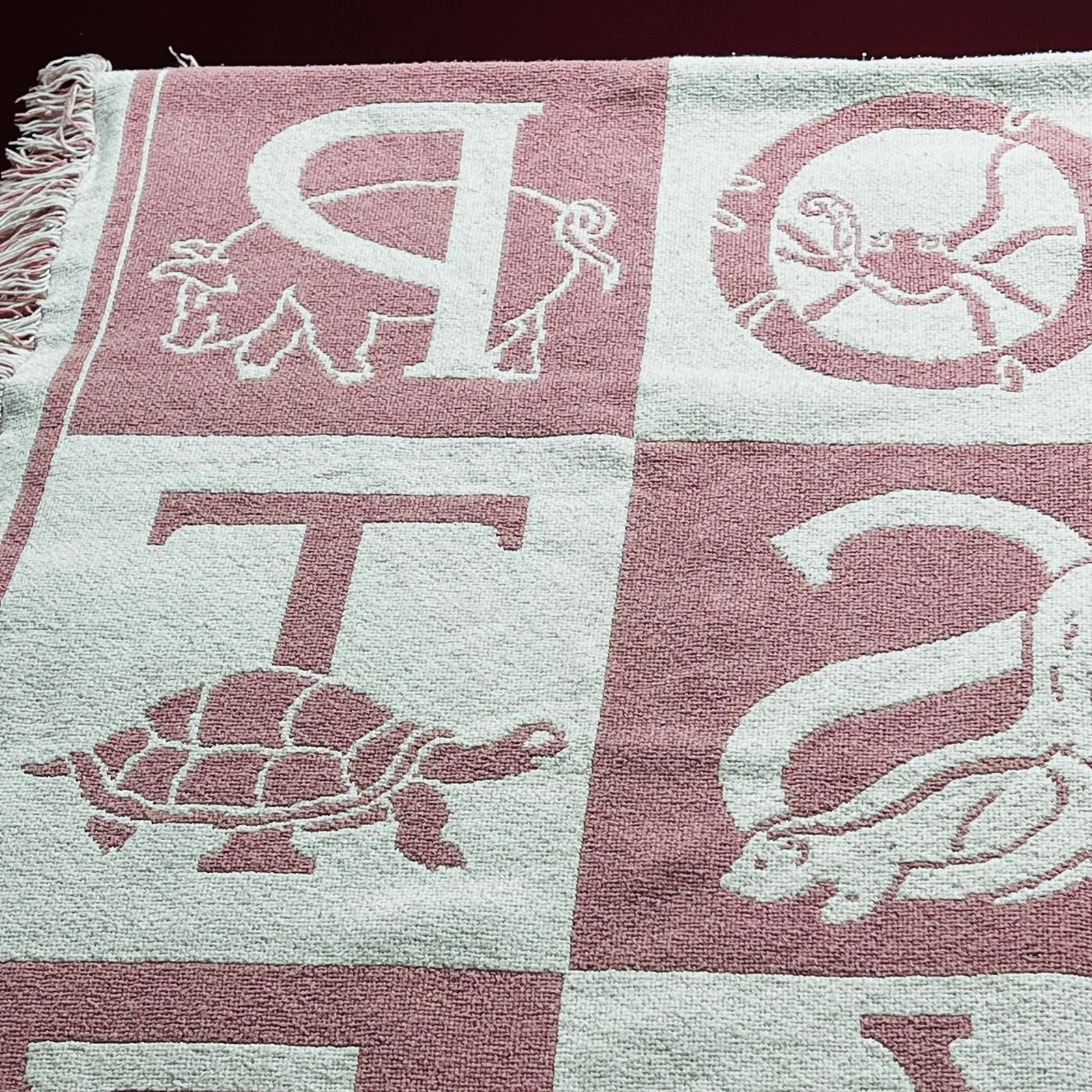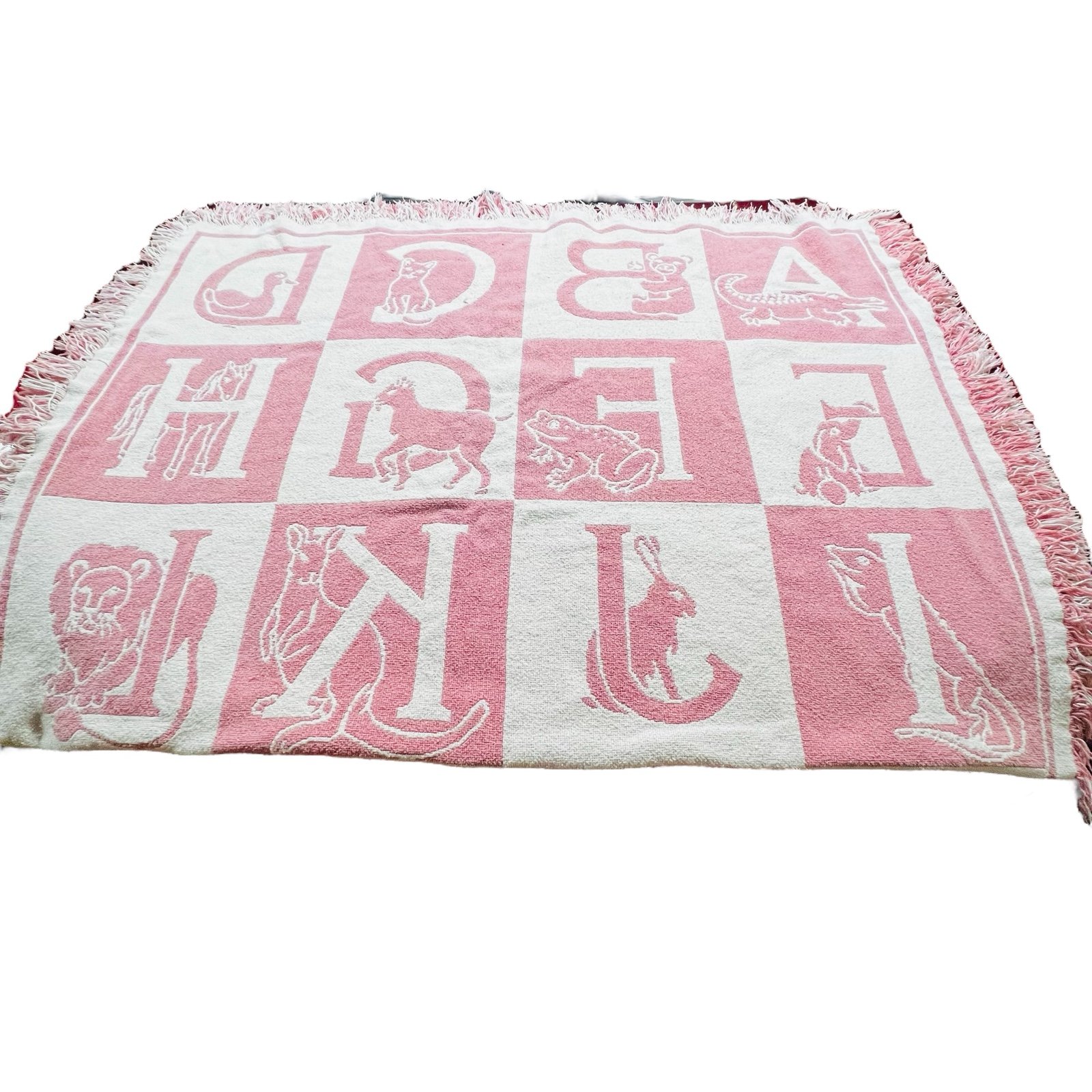 This vintage tapestry throw blanket features the ABC’s along with an animal representing each letter. It’s in good vintage condition with a few minor pulls and one small dark spot on the Q. Perfect for a vintage themed nursery. It measures approximately 64” X 42”