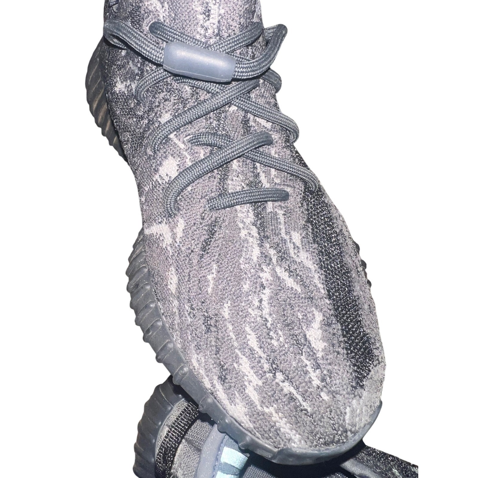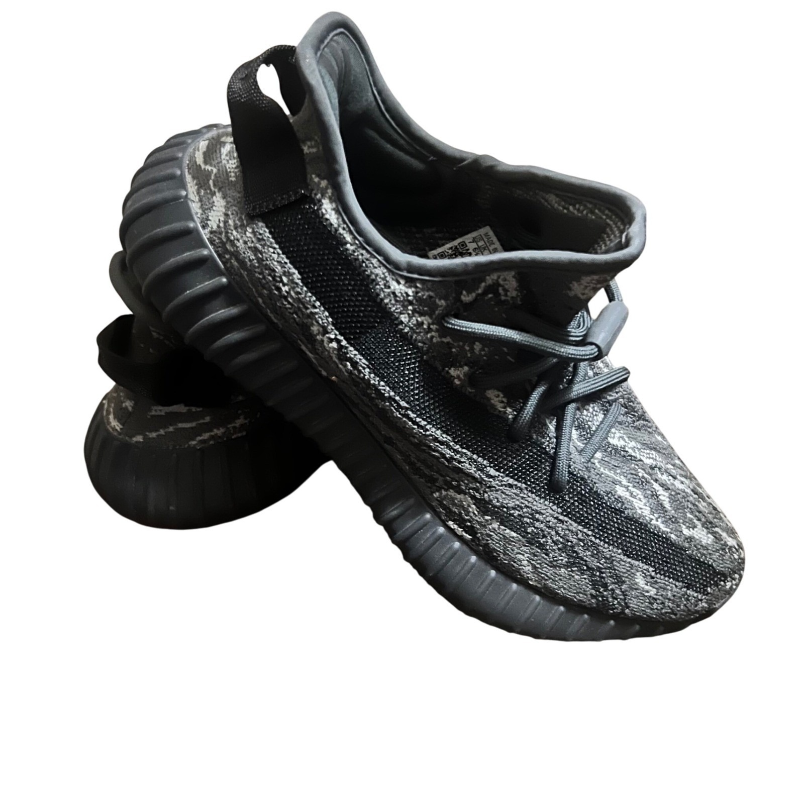 Adidas Yeezy Boost 350 V2 sneakers in a striking gray and white camouflage pattern. These iconic athletic shoes feature a breathable knit upper, a comfortable sock-like fit, and the signature Boost sole for exceptional cushioning and energy return. The distinctive side stripe adds a modern touch, making these sneakers a versatile choice for everyday wear or casual outings. Perfect for street style enthusiasts, athletes seeking comfortable footwear, or collectors of coveted sneaker designs.