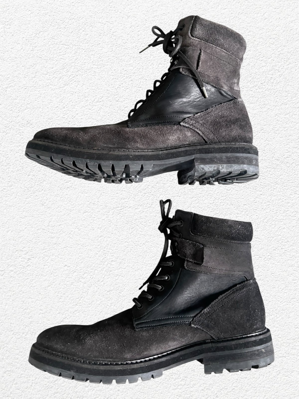 All Saints Black Suede Leather Combat Boots in a mens size 43. Made with high-quality leather, both the upper and lining materials ensure a comfortable fit. The lace-up closure adds a secure and adjustable element to the design, perfect for everyday wear.