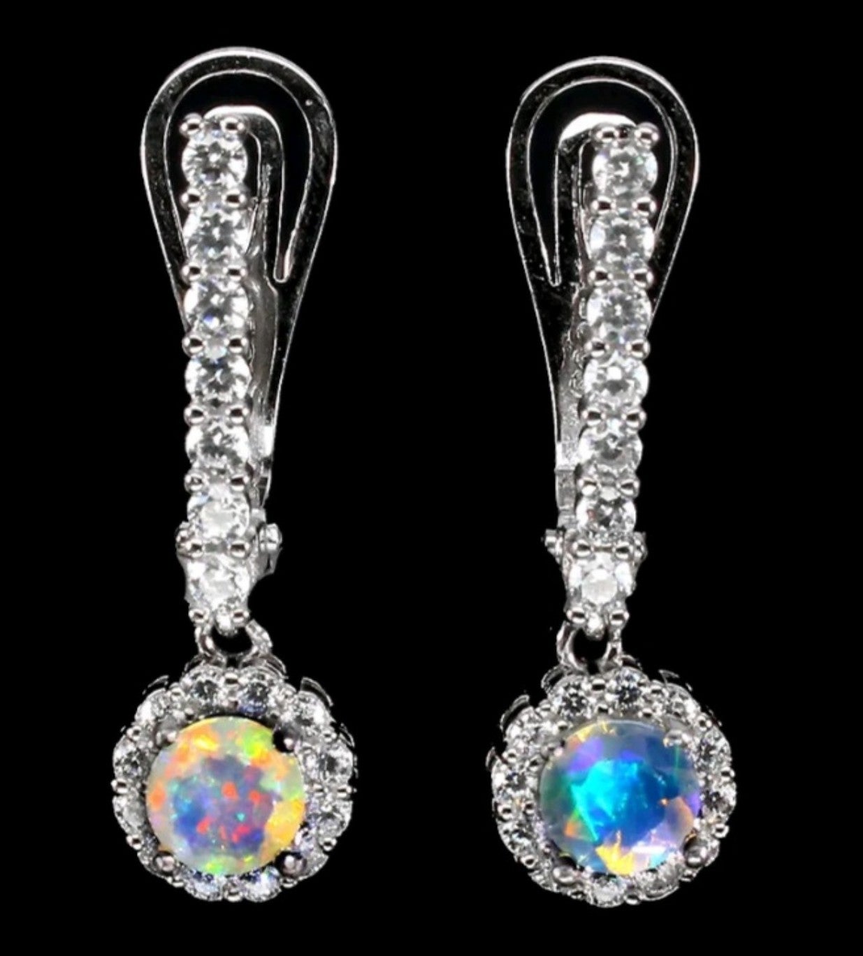 New* Handcrafted at my bench.. NATURAL Australian Fire Opals & Simulated Cubic Zirconias Set in 925 Sterling Silver and Electroplated with 14k White Gold Dangle Earrings. I've made these so that the backs to the Earrings are made onto them, so you'll NEVER lose one. Stone dimensions and details can be found in the last photo above.