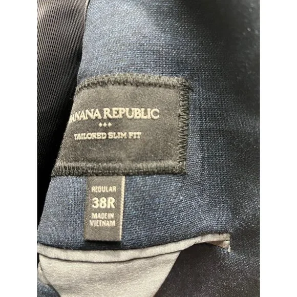Made with lightweight 100% wool from Italy's renowned Reda mill, which traces it roots back to 1865. Notch lapel. Two button closure. Double vent at back. 3 exterior pockets, 4 interior pockets. Fully lined.Features:• Banana Republic• Slim fit• Tailored• 2 button closure• 3 Exterior pockets• Tailored Slim Fit• Year-round• Solid Blue• Made in Vietnam• Dry-clean• LinedSize: Mens 38 RegularCondition: Pre-Owned GoodGently worn. Very good condition.