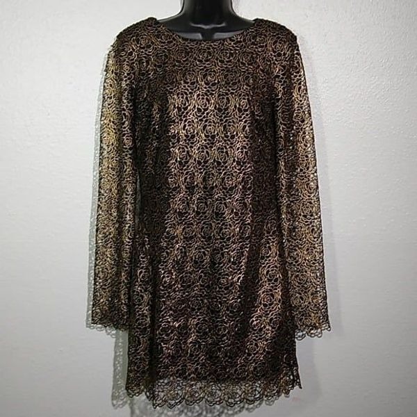 As Seen On Hannah of Champagne Lifestyle on a Beer Budget blog! Roses, gold, and luxe fashion ... what more could a girl want? It's true, the Dress the Population Victoria Black and Gold Dress has it all, with cutout gold embroidered rosettes create a stunning lace-like overlay atop a black woven sheath. Darted bodice has a rounded neckline and long sheer sleeves with scalloped cuffs. A matching scalloped hemline completes this breathtaking look. Hidden back zipper. Bodice is lined, sleeves are sheer. 100% Polyester.