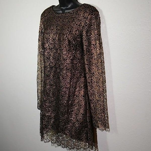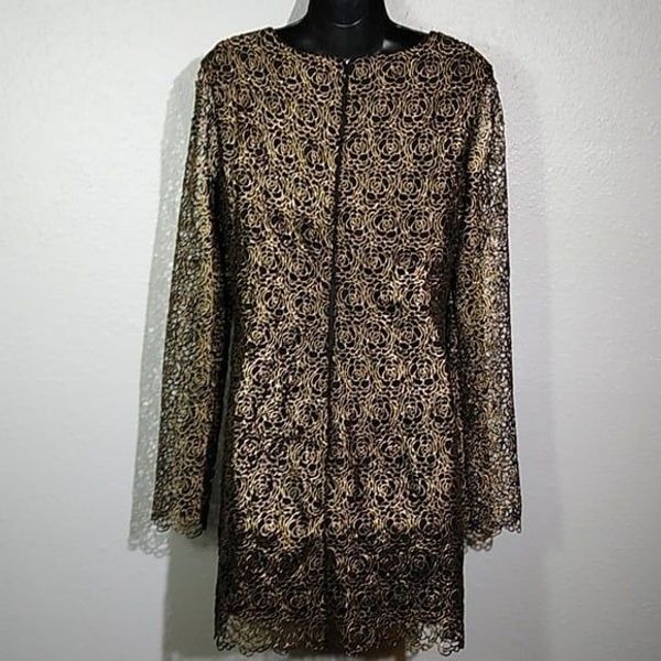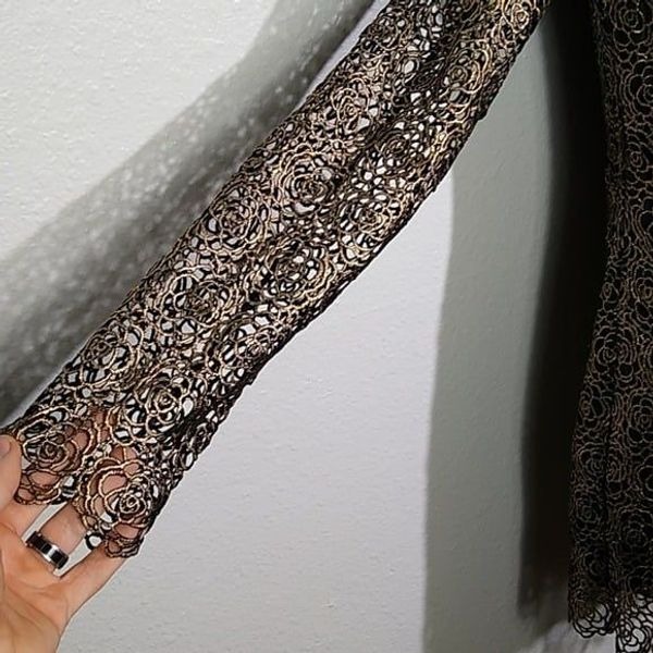 Beautiful black lined dress with a complete embroidered gold floral lace overlay