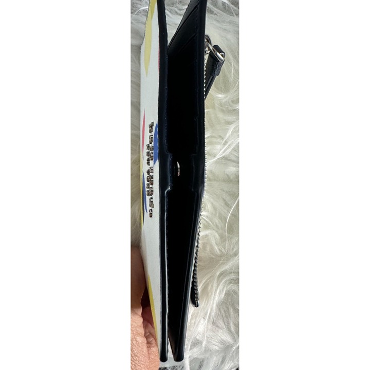 Snap closure, exterior zipper slot, approx. 3.75" x 6.75" x 5.75". Silver hardware, Saffiano PVC, ID slot, 12 card slots