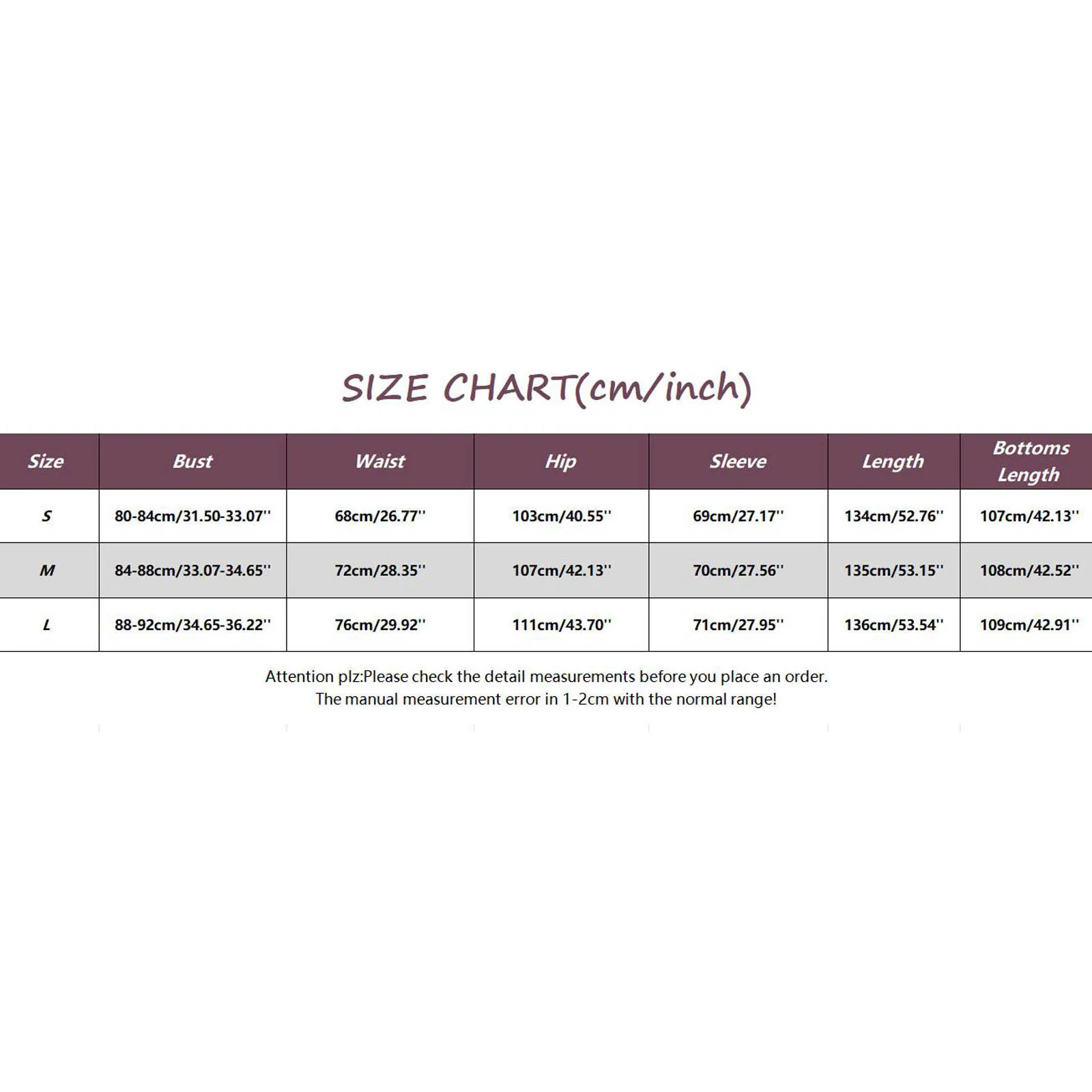 | Size:S | Bust:80-84cm/31.50-33.07'' | Waist:68cm/26.77'' | Hip:103cm/40.55'' | Sleeve:69cm/27.17'' | Length:134cm/52.76'' | Bottoms Length:107cm/42.13'' |