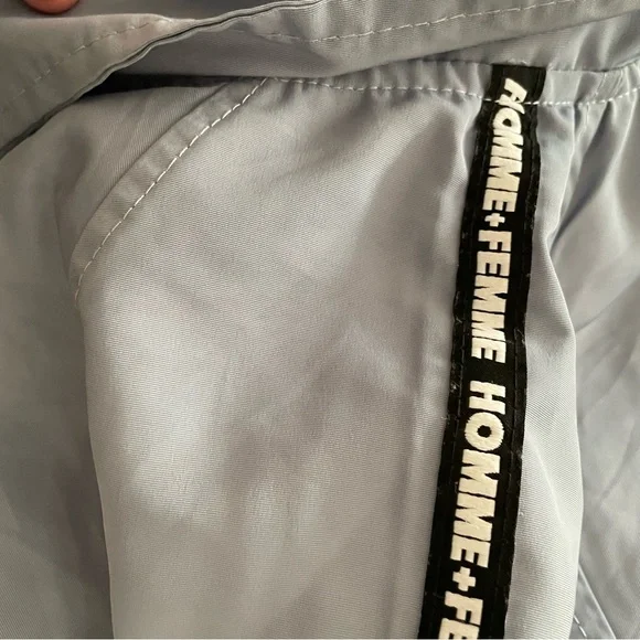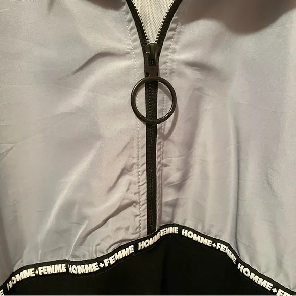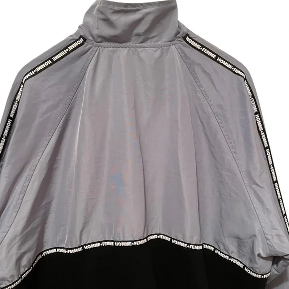 Homme + Femme 1/2 Zip Jacket Pullover Size - 3XLColor - Gray & BlackGood gently used conditionLogos all down sleeves and across front Top is silver slick material bottom is black stretchy materialPockets on sidesSee all pictures and always check measurements AGAINST ONE OF YOUR like garments, as brands vary in their sizing and shrinking!Measurements taken with garment laying flat. See approx measurements for your fit!Shoulder to shoulder ~ 23” Underarm to underarm ~ 28”Shoulder to front hem ~ 27”Sleeve length ~ 29”