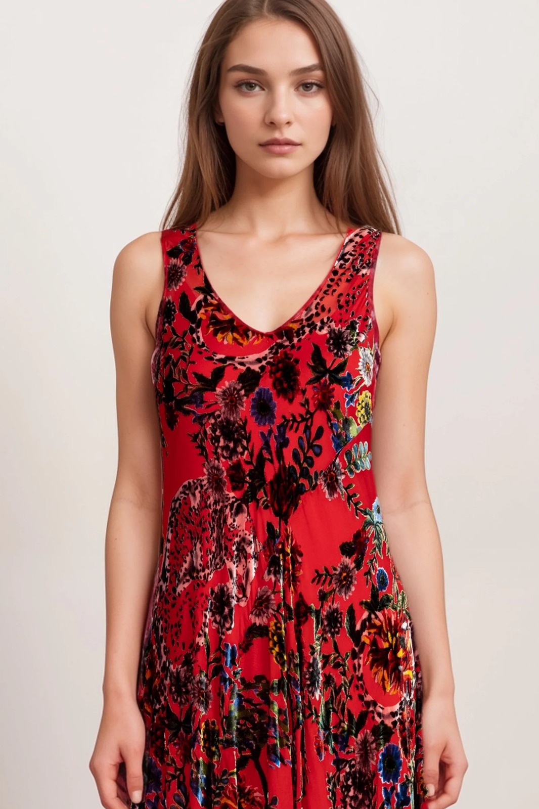 The Bias sleeveless dress from Johnny Was is styled with a bobcat-inspired print.
