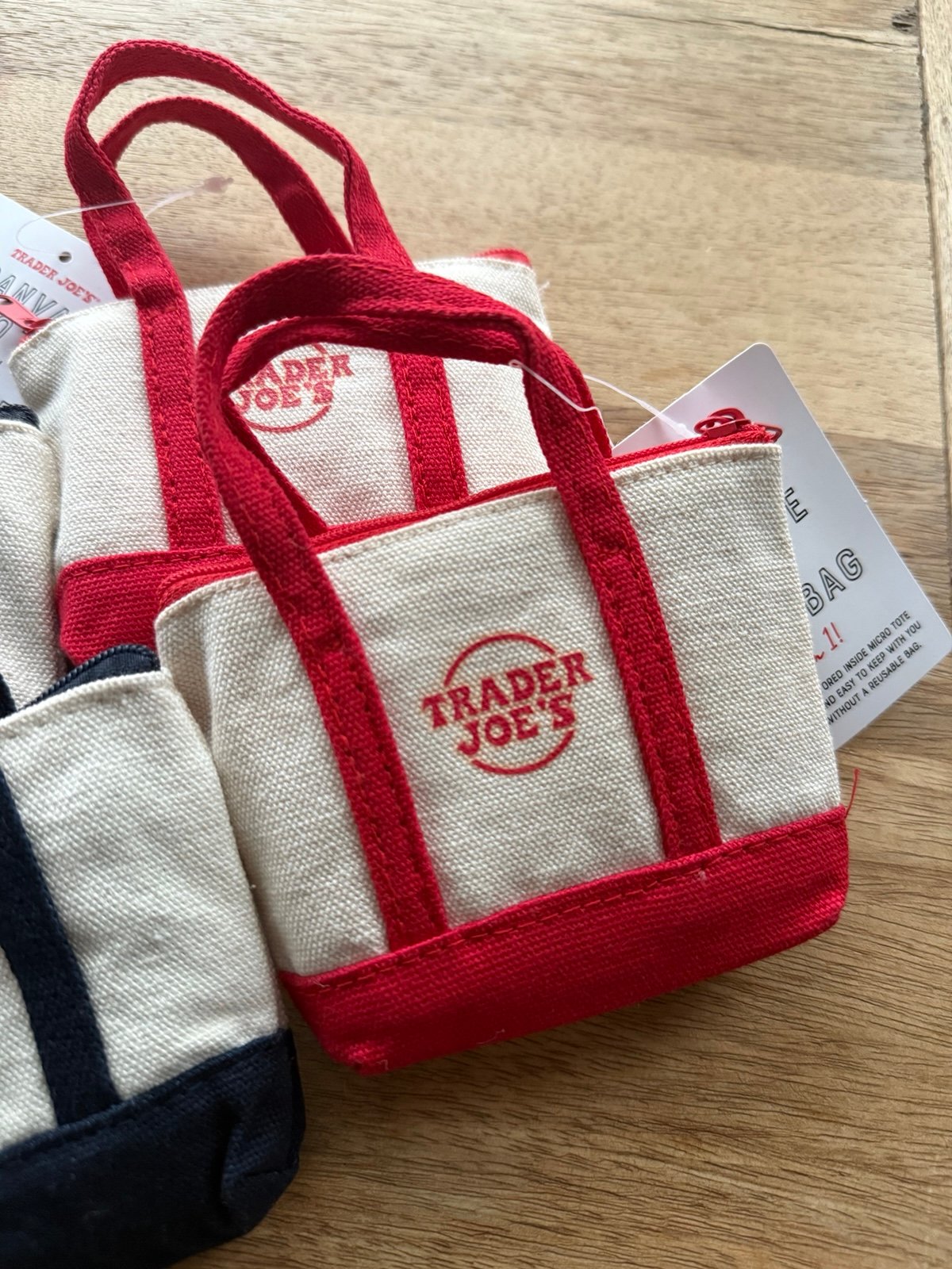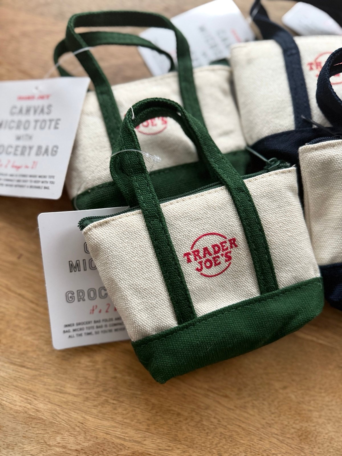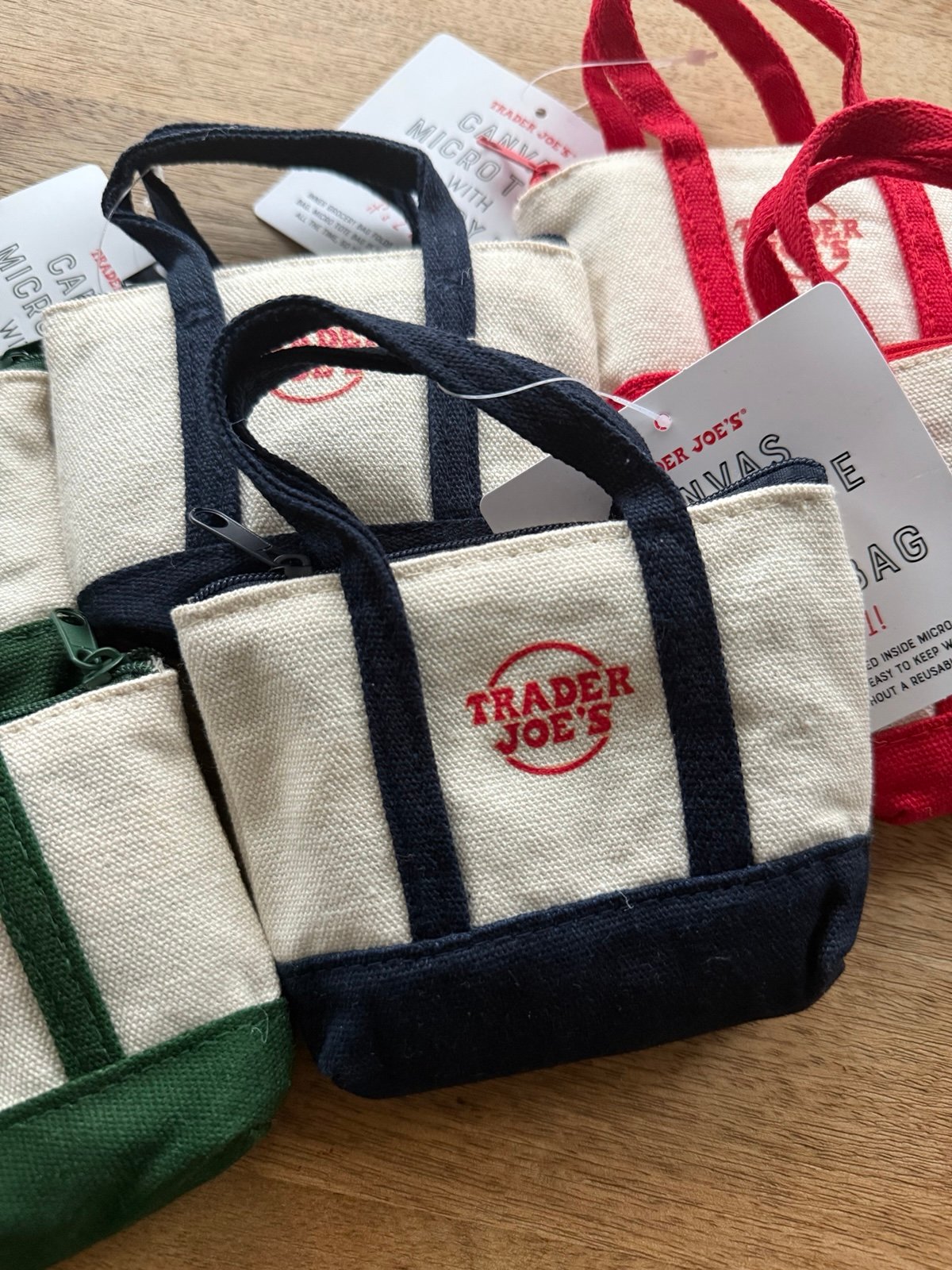 NEW limited edition Micro Mini Cavas Totes. Set of SIX Trader Joes Micro Canvas Mini Tote with Grocery Bag inside. You will receive 2 of each color as shown in pics. Each canvas micro mini tote includes a foldable inner grocery bag zipped inside, 2 bags in 1! Compact, lightweight, and perfect for spare change, cosmetics, earbuds, or as a mini high-fashion clutch. Also great for gifting or everyday essentials.