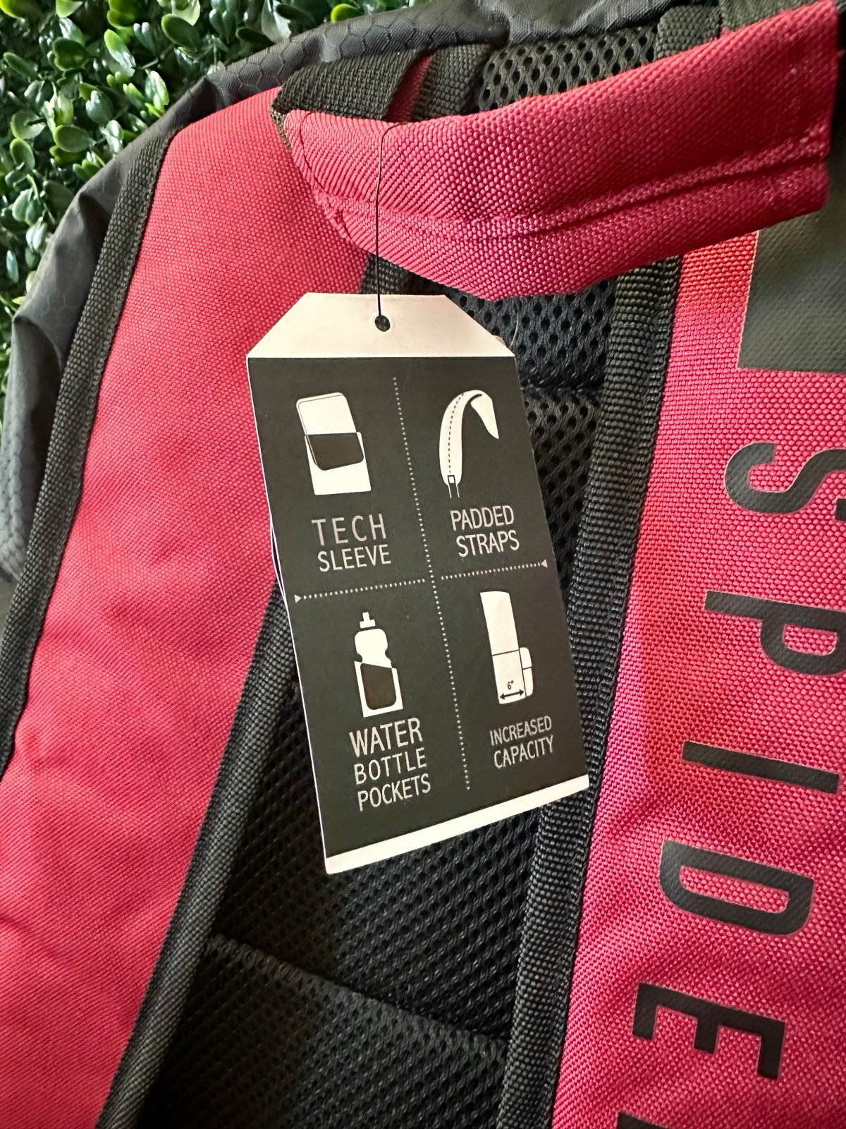 Inspired by Miles Morales, this backpack has a puffed spider patch and spiderwebs. Comes with a large buckle front pocket and 2 mini buckle pockets. Includes a padded back and straps, side mesh pockets and an interior laptop pocket.