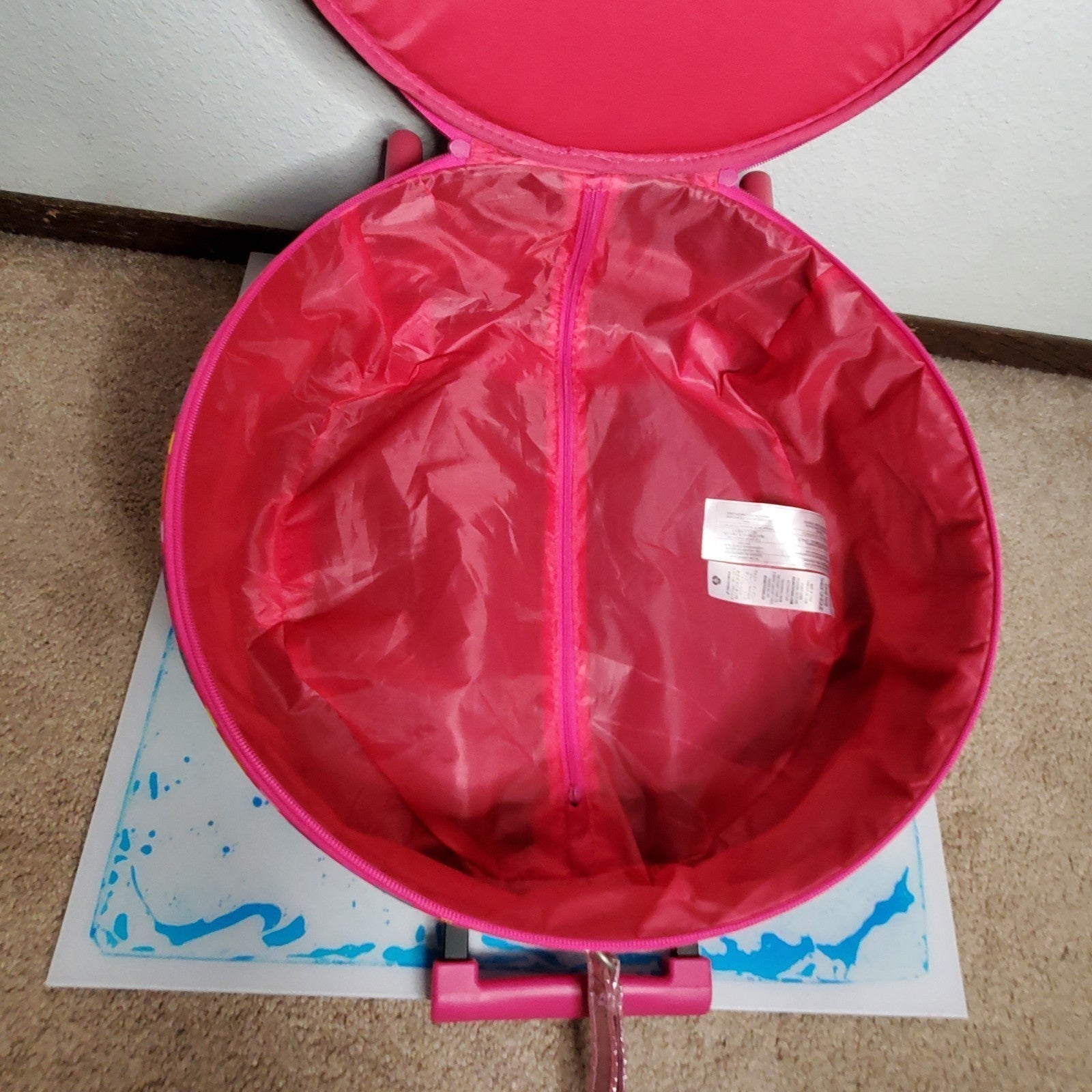 Minnie Mouse Luggage with colorful design in the front. This luggage is so cute and was actually never used. This item is new without tags. Please see close up pictures of wheels. They are perfectly clean! No rips or stains inside, either.