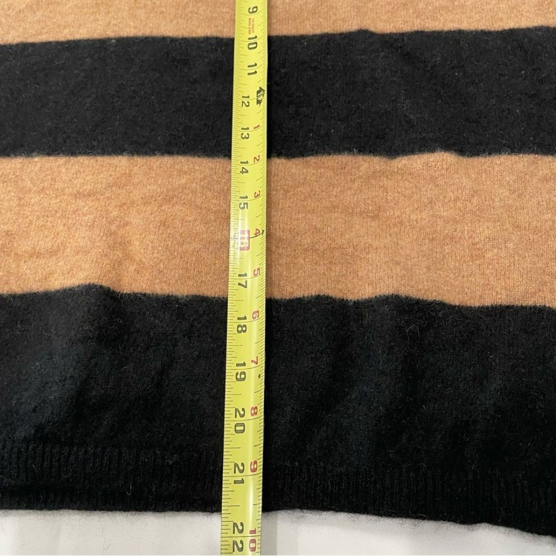 Luxurious Minnie Rose 100% cashmere sweater in size XS/S featuring bold navy and camel stripes with sage green contrast trim. This oversized pullover showcases a classic V-neckline, relaxed short sleeves, and premium cashmere construction for ultimate softness and warmth. The colorblock design adds visual interest while maintaining sophisticated appeal. Perfect for elevated casual wear or layering during transitional seasons.
