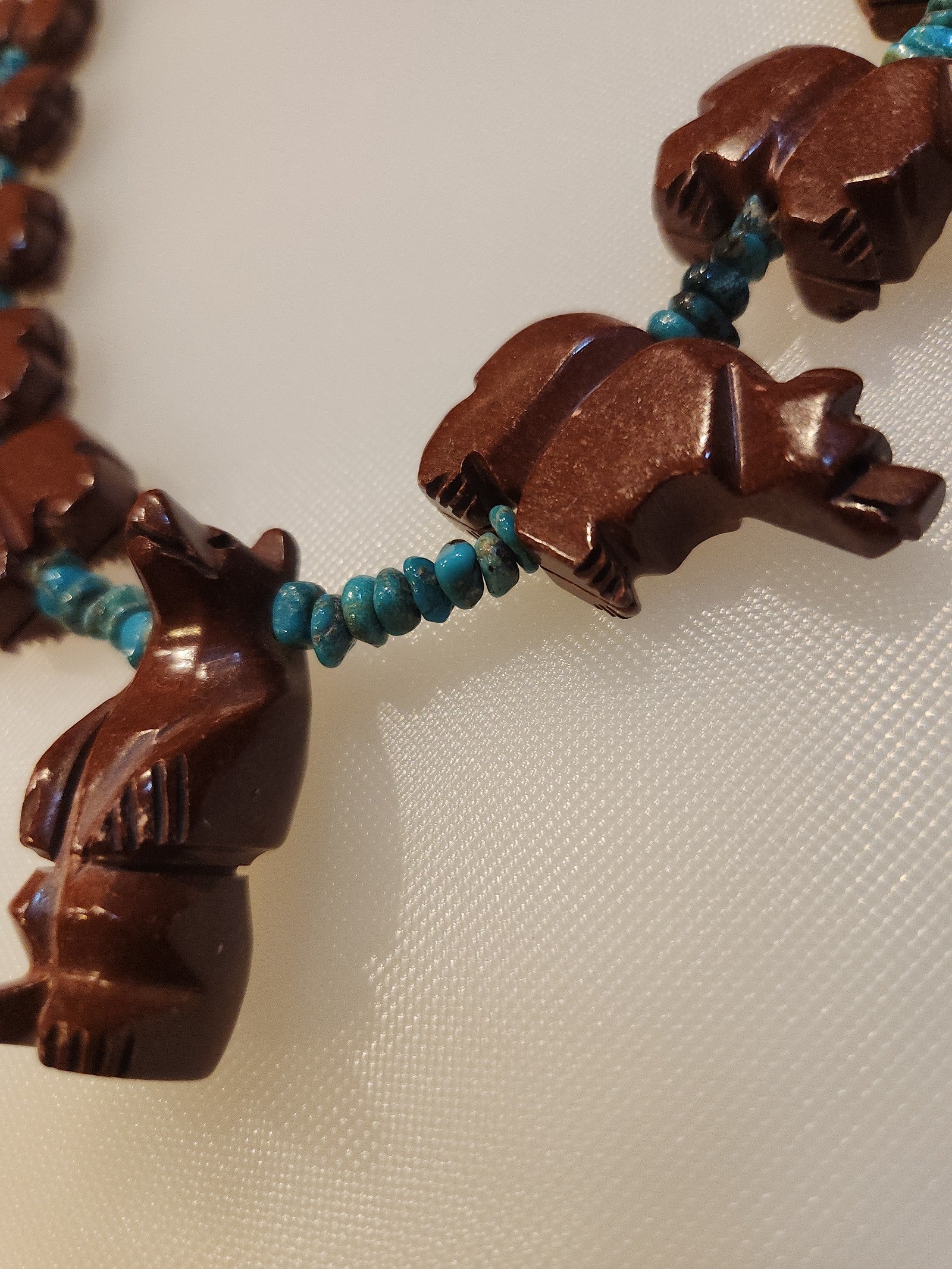 Native American Completely Hand Carved Vintage Navajo Turquoise Pipestonebear Necklace Absolutely beautiful piece in amazing condition. No breaks. 30" long . 181 grams. 15 individually carved bears, turquoise stones and serling silver... Great Find...