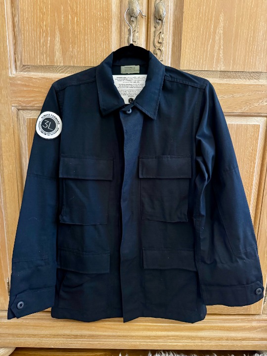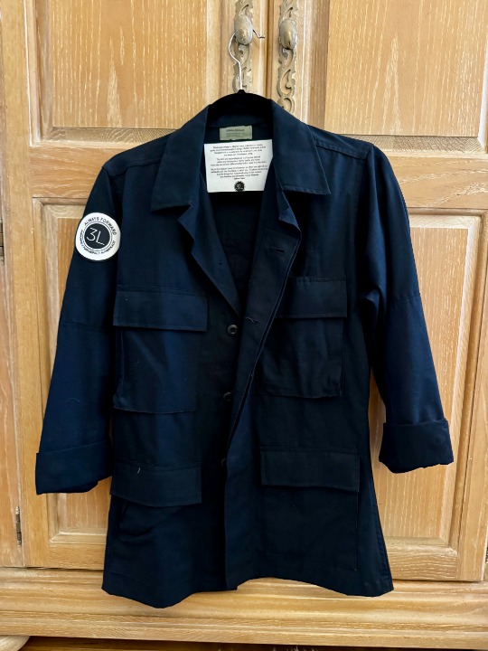 Navy canvas jacket with beautiful beaded heart on back. Sleeves can be worn up or down. Unlined, x-small regular. Purchased at an art fair in Seattle from Third Layer Living, a lifestyle brand that upcycles the practical and makes it beautiful. Unfortunately, it turned out to be too small (I'm an optimistic medium), so it was never worn.