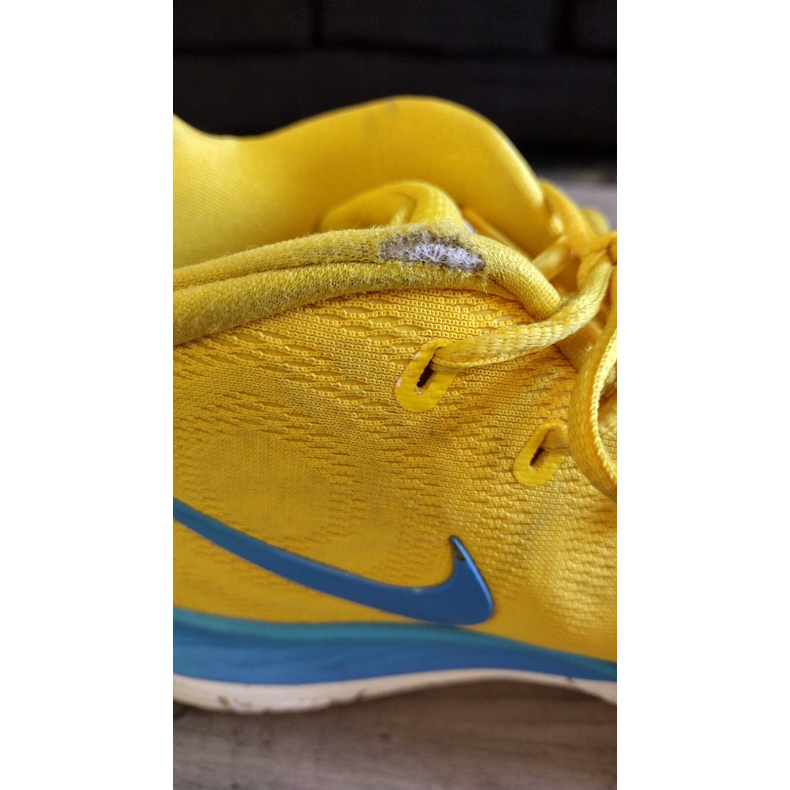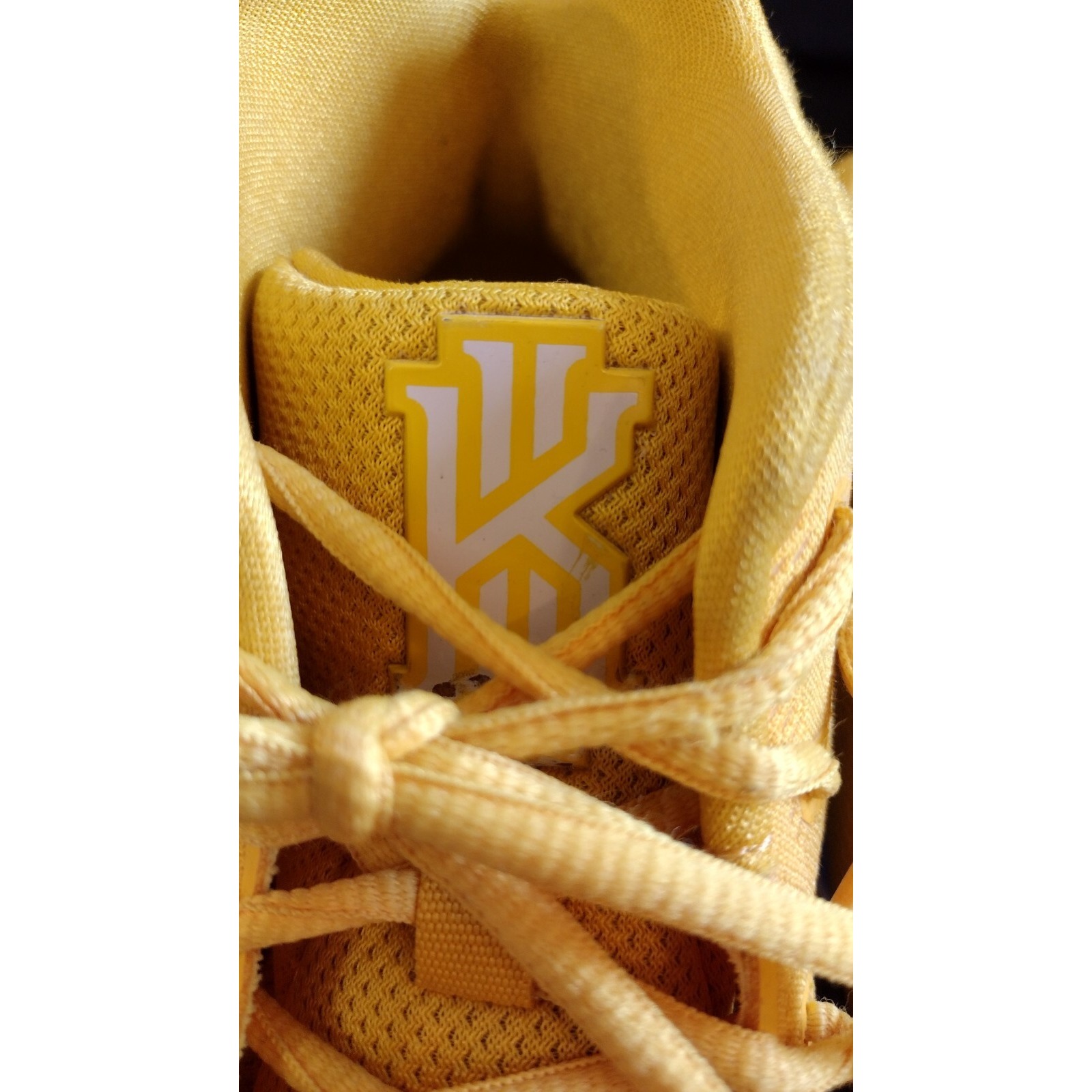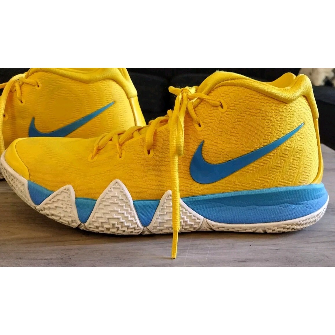 Ignite your game with these vibrant Nike Kyrie IV basketball shoes. A burst of sunshine yellow dominates the upper, accented by a striking blue swoosh and midsole detailing, creating a bold and energetic look. The unique sole design provides exceptional traction and responsiveness, allowing for quick cuts and explosive movements on the court. These sneakers are not just about performance; they're a statement piece that blends style and functionality seamlessly. Perfect for dominating the court, hitting the gym, or adding a pop of color to your casual streetwear.