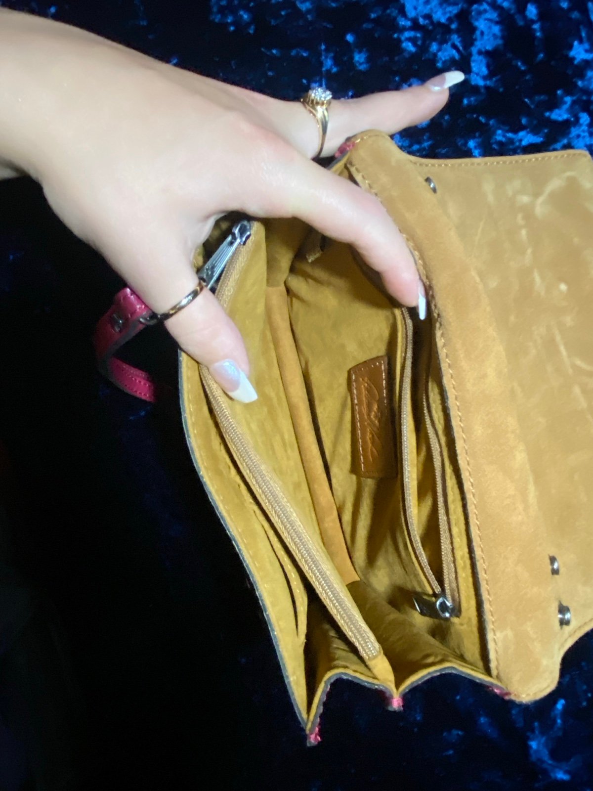 The interior includes a zippered pocket and two slip pockets for organization, with an additional slip pocket under the flap.