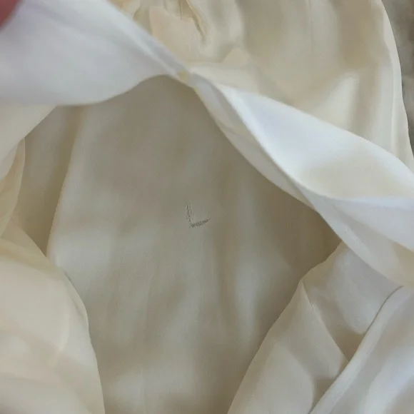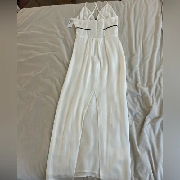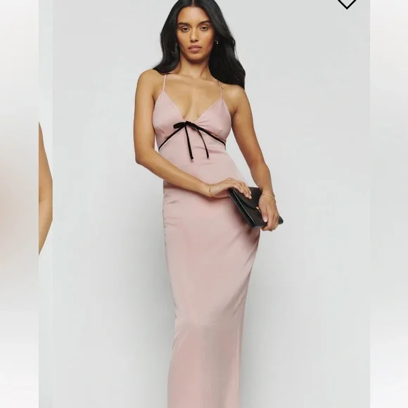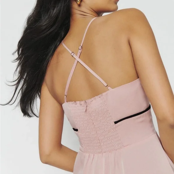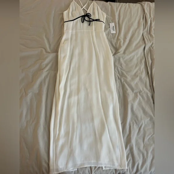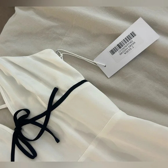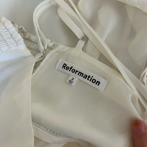 Reformation Bryony Dress in WhiteThe pictures of the model are for reference, the dress for sale is WHITEThe black and white contrast is beautiful.Double linedThere’s a small rupture on the inside lining, I included a picture. You can’t see anything from the outside.How dreamy. The Bryony is a sleeveless, midi dress with adjustable, spaghetti straps, a V-neckline, and contrast piping with a center front bow detail. It features a slim, column skirt with a center back slit as well as a smocked, back bodice with a zipper closure for a little extra stretch.