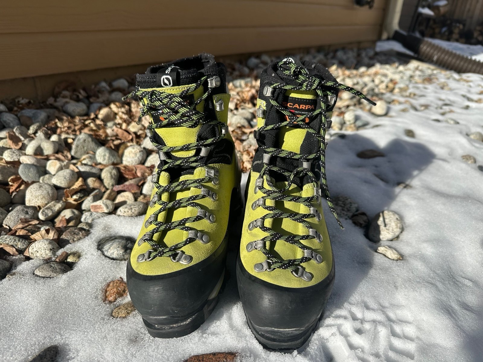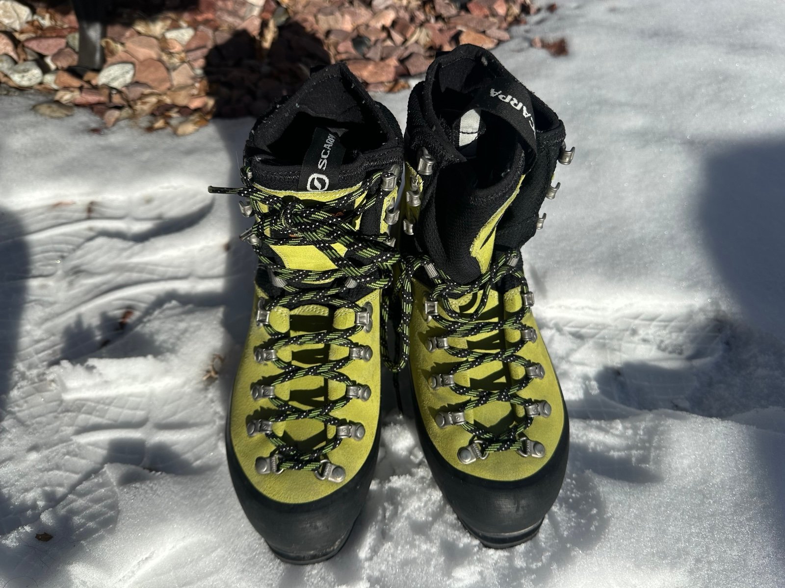 Seen ice five times. Once in Ouray, CO, twice on a glacier and twice on waterfall ice. They’re great boots. I tried to make them work, unfortunately they’re just too tight for me. See photo of tongue for sizing info.