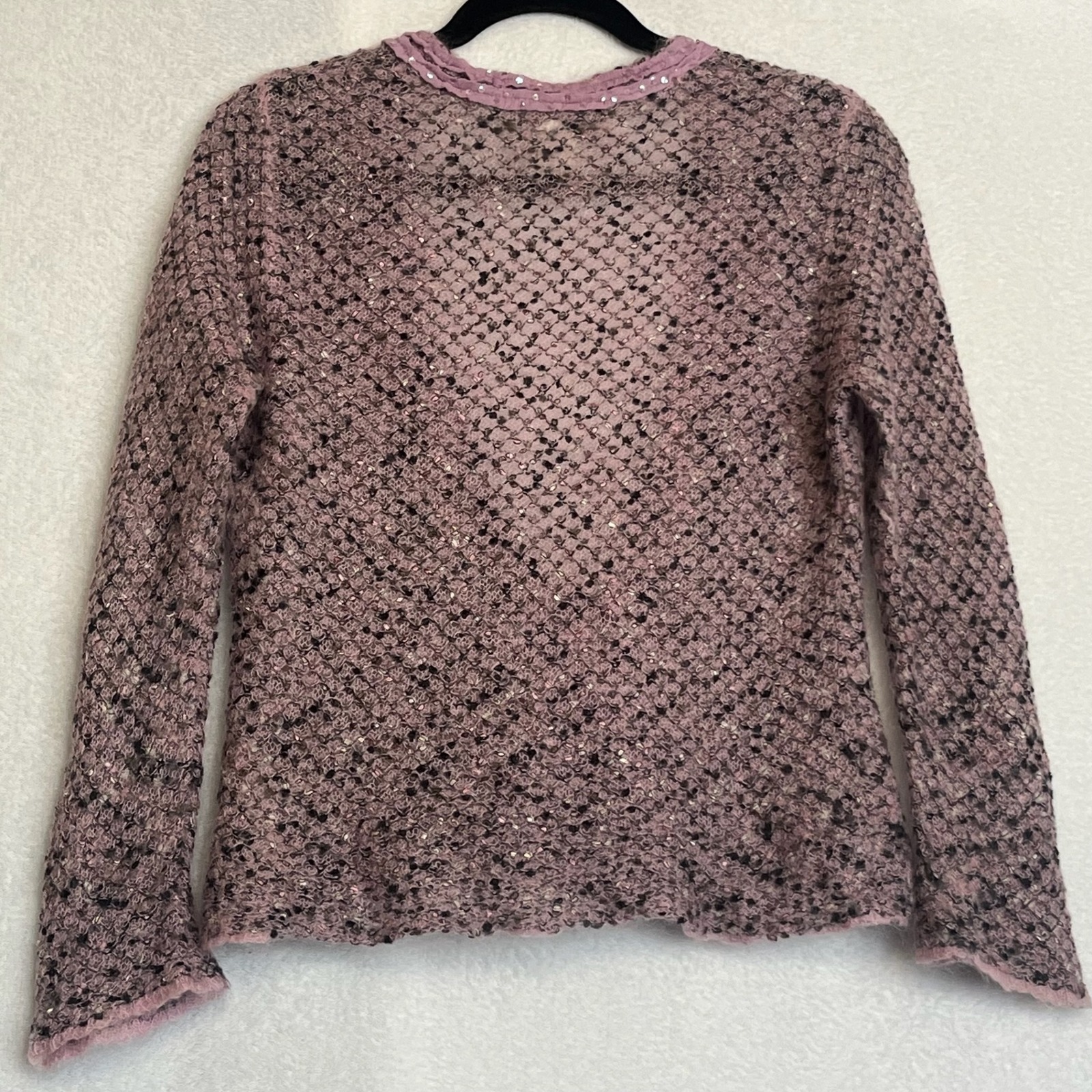 This cardigan has a tie closure & is adorned w subtle sequins throughout the knit, adding a touch of sparkle & sophistication. The soft pinkish - lavender hue complements the intricate knit pattern, creating a visually appealing texture. Perfect for layering over a simple top for a casual brunch, adding a touch of elegance to an evening outfit, or providing a cozy layer on a cool summer night.