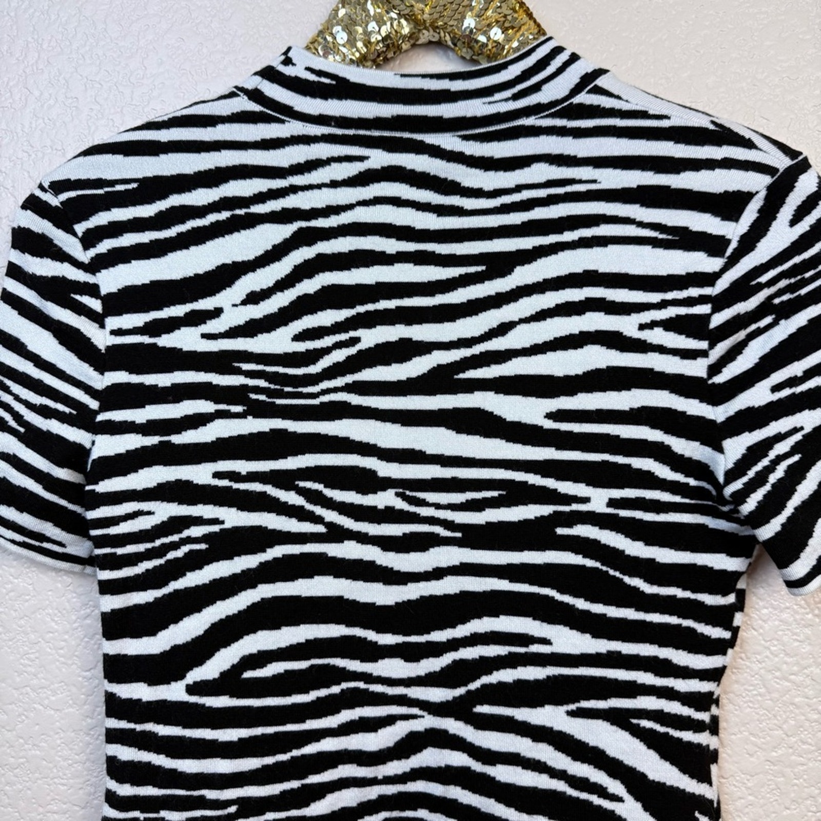 Details: Crafted from a mid-weight viscose-wool blend from Italy, this sweater tee offers a refined take on animal in an allover zebra pattern. It’s cut in a mock-neck silhouette with a slim fit for easy layering under blazers and jackets alike. Size S. Excellent Preowned Condition.
