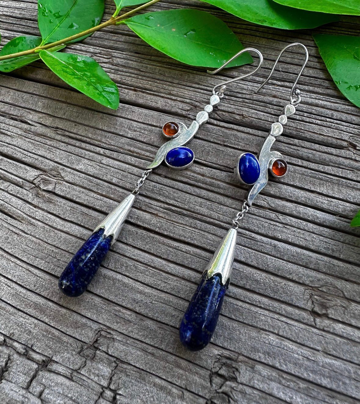 Up for offer is a stunning pair of vintage Artisan hand crafted modernist style solid sterling silver, lapis lazuli, and amber long teardrop pendant drop dangle earrings. These earrings are not marked but the metal has been both magnet and acid tested as being solid sterling silver.