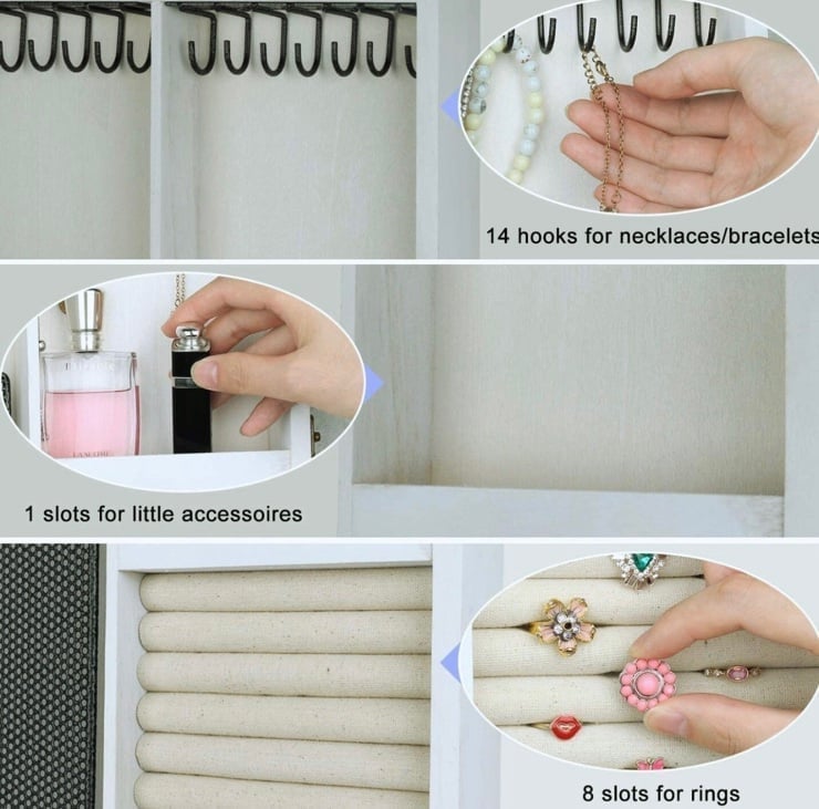Wall Mounted Hanging Jewelry Box Organizer Rustic Wooden Jewel Cabinet for Necklaces, Bracelets, Earrings, & Rings. (White). Hang in your Bathroom, Bedroom, Closet, or anywhere else.