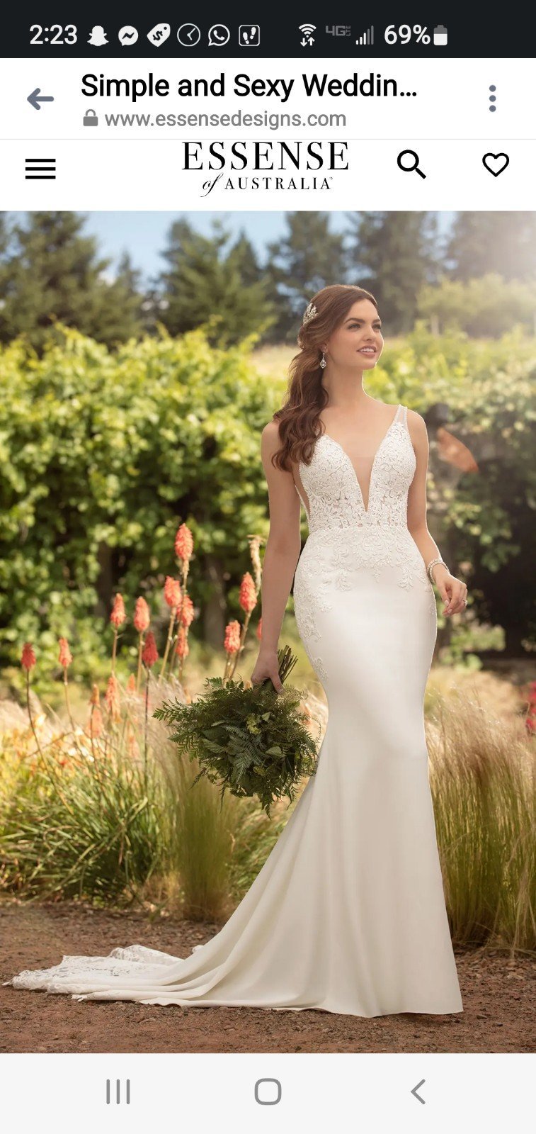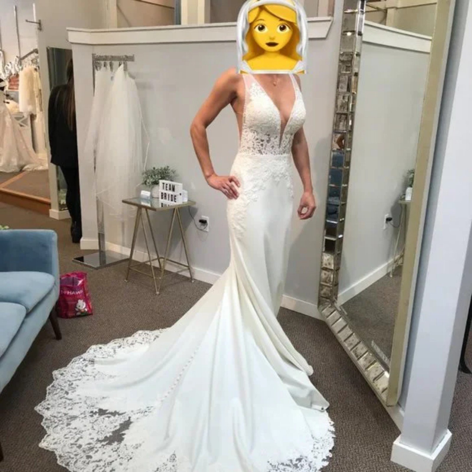 A plunging V-neckline is the focal point of the front of this sheath silhouette and is accented with plunging side cutouts on either side. Graphic lace adorns the bodice, and extends down through the hips of the gown, helping to shape the body. Sheer straps extend from the bodice and extend to the back of the gown into a dramatic deep V-back, complete with sheer lace detailing. Laser-cut lace highlights the hem of the train and is enhanced with beading for an even more dramatic effect. The back of this simple wedding dress zips up beneath fabric-covered buttons.