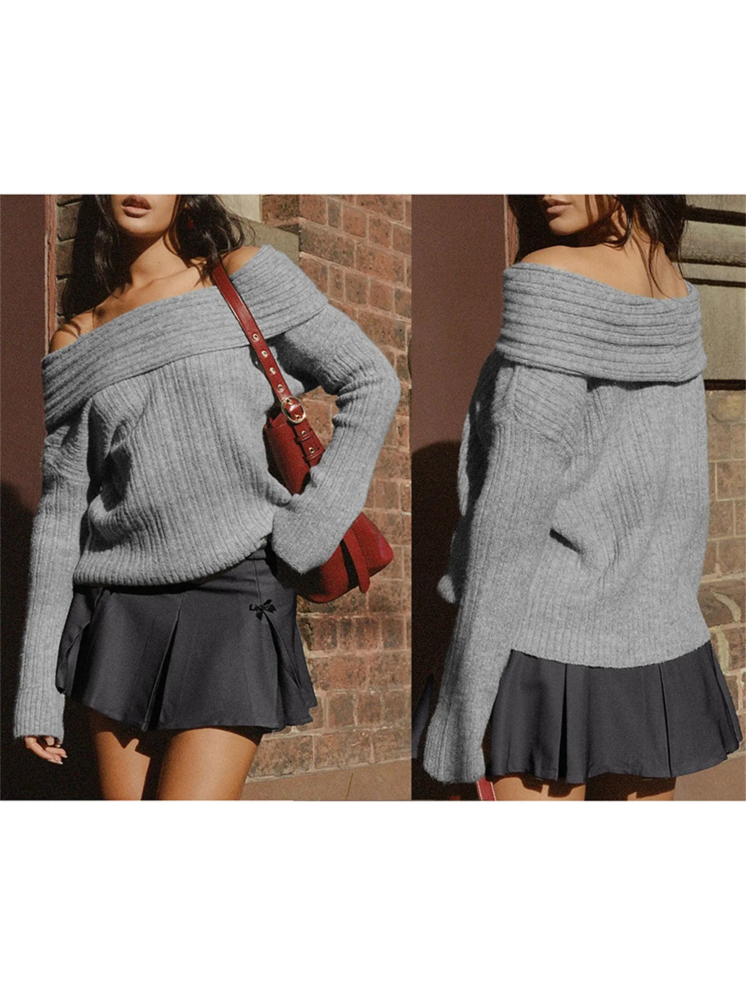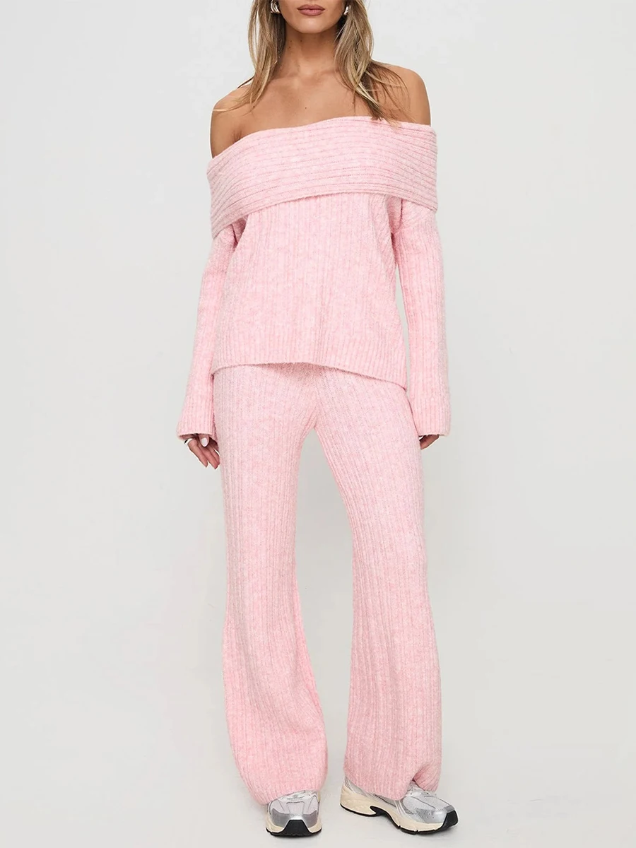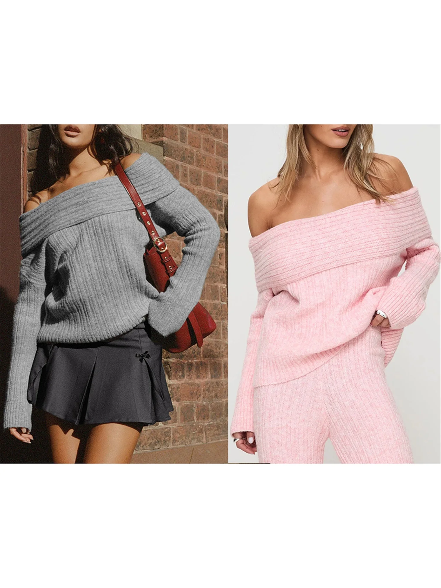 Women's Off Shoulder Sweaters Chest Folding Boat Neck Solid Color Long Sleeve Casual Ribbed Knitted Tops