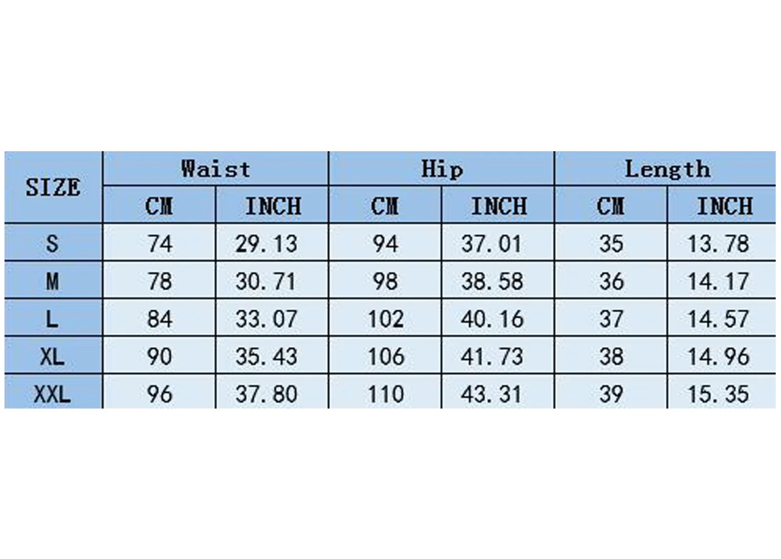 | Size:L | US Size:6-8 | UK Size:10-12 | EU Size:36-38 | Waist:84cm/33.07'' | Hip:102cm/40.16'' | Length:37cm/14.76'' |